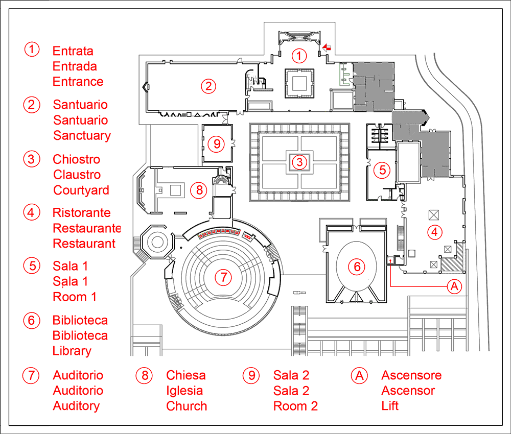 The first terrace or block, the highest in reference to the lake, includes a congressional center, with all the services for simultaneous translations, with the ability to accommodate 300 persons. It can be used for international theological conferences, for biblical studies, Episcopal Conference meetings, meetings for the permanent formation of presbyters, or even for periods of formation for seminarians in the last stage of preparation for the priesthood.